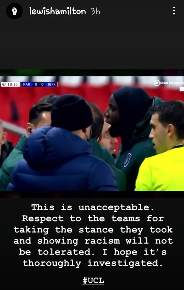 Il campione di Formula1 ha parlato sui social di quanto successo sul campo di PSG e Basaksehir