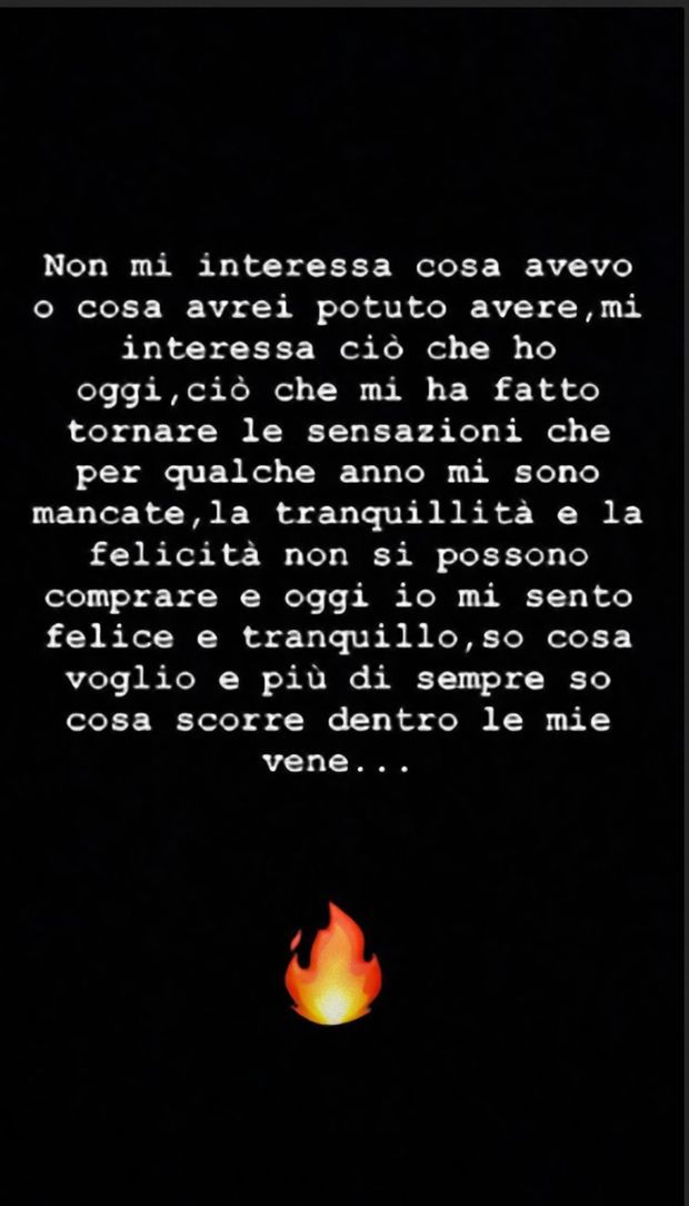 "Non mi interessa cosa avevo o cosa avrei potuto avere. Mi interessa ciò che ho oggi. Ciò che mi ha fatto tornare le sensazioni che per qualche anno mi sono mancate, la tranquillità e la serenità non si possono comprare e oggi io mi sento felice e tranquillo. So cosa voglio e, più di sempre, so cosa scorre nelle mie vene".