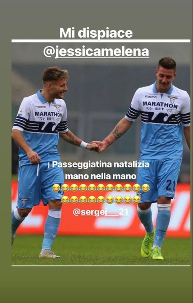 La vittoria contro il Cagliari ha riportato il sorriso in casa Lazio a pochi giorni da Natale. Ora i biancocelesti sono al quarto posto in classifica e il clima a Formello è decisamente più sereno rispetto a qualche giorno fa. Ciro Immobile, attraverso il proprio profilo Instagram, ha postato una foto che lo ritrae mano per mano con Milinkovic-Savic (autore del primo gol della partita e scoppiato in un pianto liberatorio dopo la rete) e lanciato una frecciatina, con tanta dose di ironia, alla compagna Jessica Melena: "Mi dispiace Jessica. Passeggiatina mano nella mano con Sergej", ha scherzato l'attaccante napoletano.