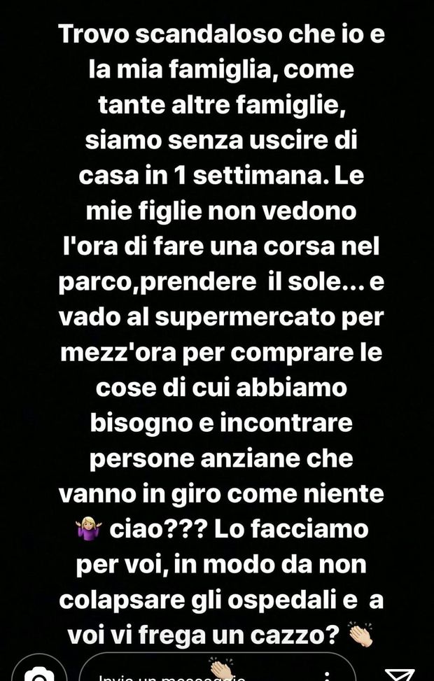 Marta Ponsati Romero, moglie del calciatore del Napoli José Maria Callejon, ha attaccato duramente su Instagram tutte quelle persone che non stanno rispettando l'ordine imposto dalle autorità di restare a casa: "Trovo scandaloso che io e la mia famiglia, come tante altre famiglie, non usciamo di casa da una settimana. Le mie figlie non vedono l'ora di fare una corsa nel parco, di prendere il sole… Vado al supermercato per mezz'ora per comprare ciò di cui abbiamo bisogno e incontro persone anziane che vanno in giro come se niente fosse. Ciao?? Lo facciamo per voi, così da non far collassare gli ospedali. E a voi non ve ne frega un ca…?".