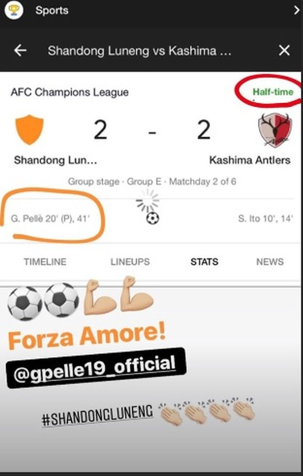 Graziano Pellé on fire. L'attaccante italiano, dopo la doppietta rifilata all'esordio in Champions League asiatica al Gyeongnam, ha segnato altri due gol nel pareggio per 2-2 contro i giapponesi del Kashima. L'attaccante del Shandong Luneng - i cinesi erano sotto 2-0 al quarto d'ora per la doppietta di Ito - ha prima accorciato le distanze su calcio di rigore al 20' e poi ha trovato il pareggio poco prima dell'intervallo. Due partite in Champions, quattro gol per Pellé che riceve un incitamento speciale dalla sua Viky. Viktoria Varga, infatti, ha pubblicato un messaggio tramite Instagram Stories: "Forza amore", recita il post della modella.