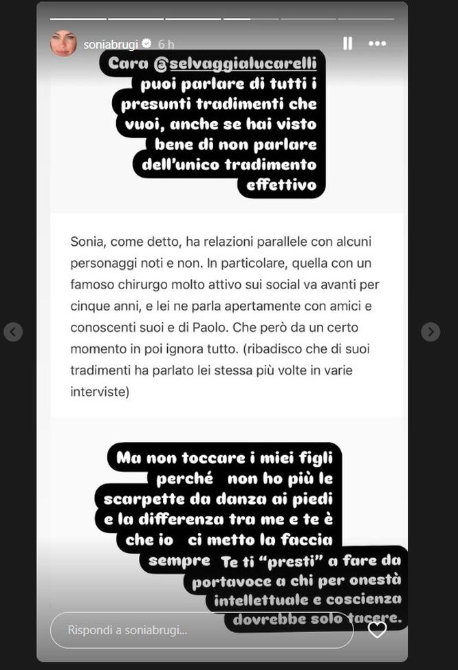 Dopodiché è arrivata un'altra storia della Bruganelli. "Cara, Selvaggia Lucarelli - ha scritto Sonia taggandola - puoi parlare di tutti i presunti tradimenti che vuoi anche se hai visto bene di non parlare dell'unico tradimento effettivo. Ma non toccare i miei figli perché non ho più le scarpette di danza ai piedi e la differenza tra me e te è che io ci metto la faccia sempre. Mentre te ti presti a fare da portavoce a chi per onestà intellettuale e coscienza dovrebbe solo tacere". Il riferimento chiarissimo è a Lucio Presta, ormai ex manager di Bonolis, che nei giorni passati, quando Bonolis aveva annunciato l'addio alla sua agenzia, aveva attaccato pubblicamente e frontalmente l'ex moglie del conduttore spiegando: "Anche le persone perbene possono finire vittima della donna sbagliata".