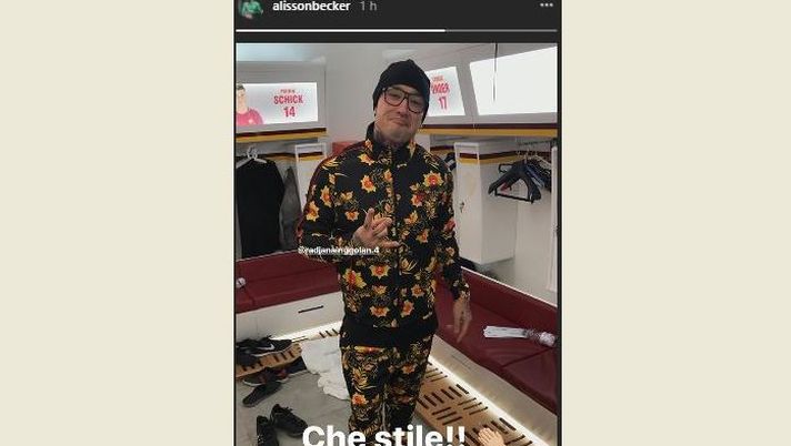 Radja Nainggolan, centrocampista della Roma - che le indiscrezioni di mercato vogliono in partenza per la Cina - è un po' estroso nel suo modo di vestire. Alisson, il portiere giallorosso, ha fatto una foto del suo abbigliamento di oggi e ha scritto: "Che stile". Una tuta particolare, diciamo un po' eccentrica, quella scelta dal belga che ha attirato l'attenzione del compagno e ha scatenato la sua ironia.