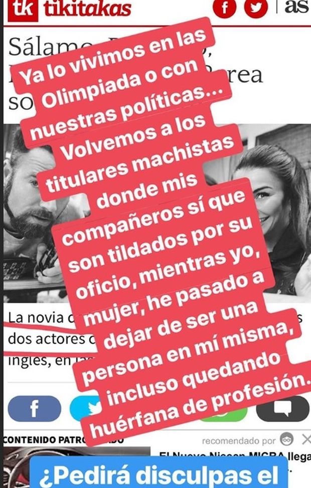 "L'abbiamo già vissuta con le Olimpiadi o in politica. Siamo tornati ai titoli sessisti dove i miei compagni sì che sono etichettati per il loro lavoro, mentre io, donna, ho smesso di essere una persona e di avere un lavoro". Con questo messaggio su Instagram, Sara Salamo, attrice, modella e compagna di Isco, attacca la stampa spagnola per titoli a suo dire sessisti che non danno giusta dignità al genere femminile.