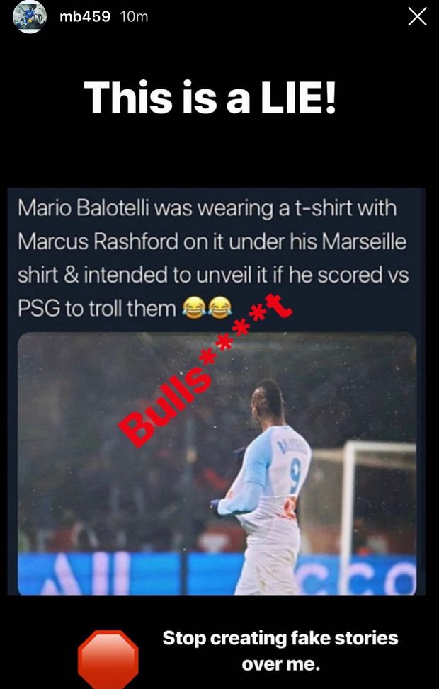 "Questa è una bugia!" Mario Balotelli ha condiviso l'ennesima fake news sul suo conto. Si legge sul web che: "Balotelli indossava una maglietta di Marcus Rashford sotto la maglietta del Marsiglia e che intendeva mostrarla se avesse segnato contro il PSG per trollarli". Decisamente troppo anche per Super Mario...