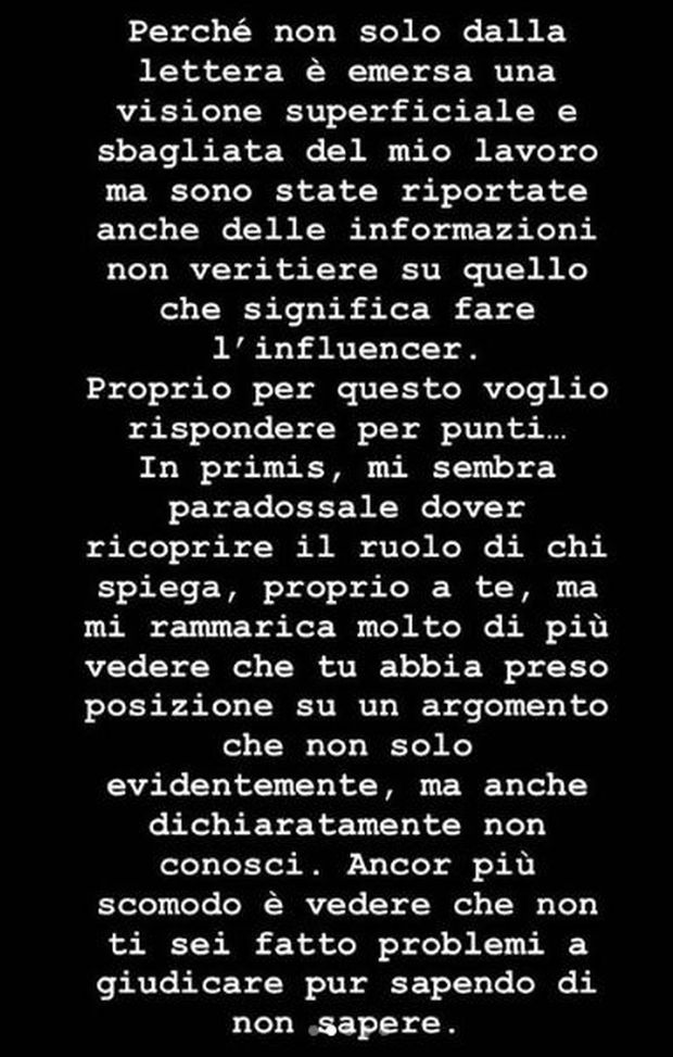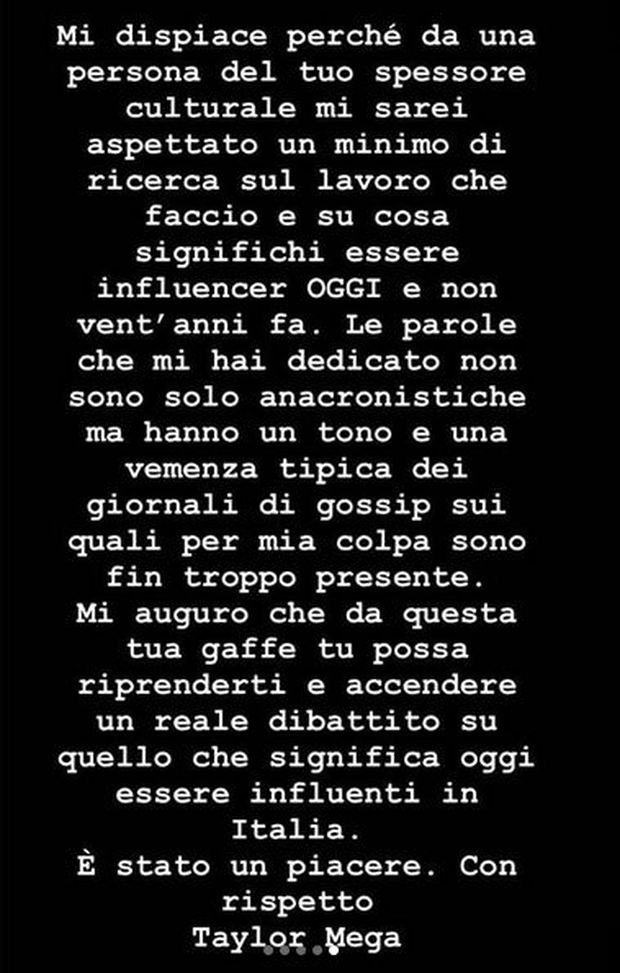 Taylor Mega non ci sta: la nota star di Instagram ha voluto rispondere con decisione a Giampiero Mughini, reo di aver attaccato lei e più in generale il mondo delle influencer. Queste le parole dell'ex partecipante de L'Isola dei Famosi: "Oggi voglio fare un passo indietro e parlarvi di una cosa che non riguarda me ma l'intera categoria della quale faccio parte. Oggi, Giampiero Mughini, scrittore e opinionista sportivo, ha scritto una lettera aperta a Dagospia parlando di influencer. Oltre a scagliarsi contro l'intero settore si è soffermato in particolar modo su di me. Devo essere sincera, non avrei mai sognato di confrontarmi con uno dei massimi esponenti della cultura italiana su un argomento che mi sta tanto a cuore. Perchè non solo dalla lettera è emersa una visione superficiale e sbagliata del mio lavoro, ma sono state riportate anche delle informazioni non veritiere su quello che significa fare l'influencer. Proprio per questo voglio rispondere per punti... In primis, mi sembra paradossale dover ricoprire il ruolo di chi spiega, proprio a te, ma mi rammarica molto di più vedere che tu abbia preso posizione su un argomento che non solo, evidentemente, ma anche dichiaratamente, non conosci. Ancor più scomodo è vedere che non ti sei fatto problemi a giudicare pur sapendo di non sapere. Confesso che non ho mai letto nessuno dei tuoi libri, motivo per il quale non ti ho mai manifestato la mia stima: non mi piace giudicare qualcuno per la sua professione solo perchè l'ho sentito qualche volta in tv e non sono così moralmente presuntuosa da giudicare un'intera categoria senza conoscerla. Ti ho sentito parlare più volte di calcio ma, anche quando l'ho pensata diversamente da te, non ho creduto tu non fossi il professionista che sei nello scrivere i libri. Per restare in tema, come si dice? Non giudicare mai un libro dalla copertina. Ho letto che hai avuto modo di parlare con un'influencer che "non mi pare che lei arrivasse a formulare una frase compiuta, balbettò qualcosa di indistinto e la cosa finì lì". Forse questo ti è bastato, però mi piacerebbe che il resto del mondo non giudicasse una categoria per una persona...Per essere davvero sinceri, caro Giampiero, se volessi fare il tuo gioco dovrei attaccarti dicendo che oggi l'editoria è morta e che il massimo esponente della tua categoria è addirittura Fabrizio Corona. Ma sai perchè non lo faccio? Perchè oggi è solo grazie alla mia influenza che qualcuno legge quelle quattro stronzate che ti sei permesso di scrivere sulla categoria e su di me in particolare. Mi dispiace perchè da una persona del tuo spessore culturale mi sarei aspettata un minimo di ricerca sul lavoro che faccio e su cosa significhi essere influencer OGGI e non vent'anni fa. le parole che mi hai dedicato non sono solo anacronistiche, ma hanno un tono e una veemenza tipica dei giornali di gossip sui quali per mia colpasono fin troppo presente. Mi auguro che da questa tua gaffe tu possa riprenderti e accendere un reale dibattito su quello che significa oggi essere influenti in Italia. E' stato un piacere. Con rispetto, Taylor Mega".