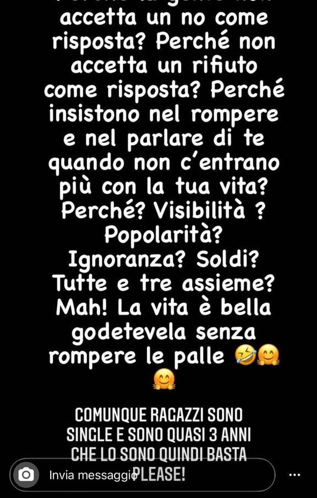 "Perché la gente non accetta un no come risposta? Perché non accetta un rifiuto come risposta? Perché insistono nel rompere e nel parlare di te quando non c'entrano più con la tua vita?Perché? Visibilità? Popolarità? Ignoranza? Soldi? Tutto insieme? Mah! La vita è bella: godetevela senza rompere le palle. Comunque ragazzi, sono single e sono quasi tre anni che lo sono quindi basta please!" Con queste parole chiare e secche Mario Balotelli ha chiuso i pettegolezzi che circondavano in questi giorni la sua vita privata.