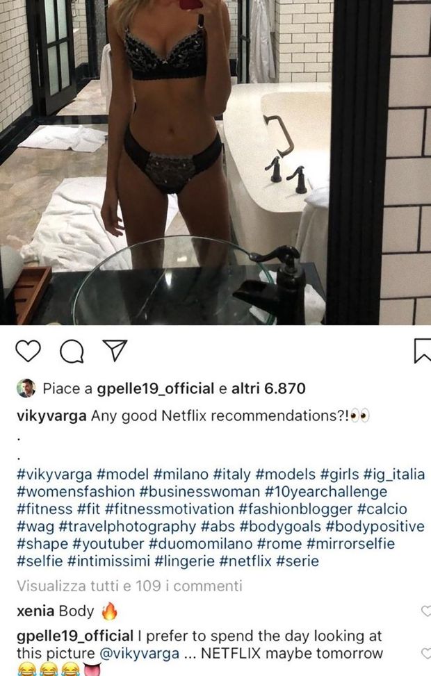 Viky Varga ha alzato a dismisura la temperatura dei social con la sua ultima foto in lingerie, e nemmeno il compagno della modella, il calciatore Graziano Pellé, ha resistito alla bellezza della ragazza, lasciandosi scappare un commento che è tutto un programma sulle intenzioni dell'ex Southampton. Con un selfie in deshabillé, infatti, Viky ha chiesto ai suoi tanti follower un consiglio su cosa guardare su Netflix. Pronta, fra i tanti commenti di fan impazziti, la risposta di Pellè, che ha commentato così: "Preferisco trascorrere la giornata a guardare la foto, Viky... Netflix forse domani".