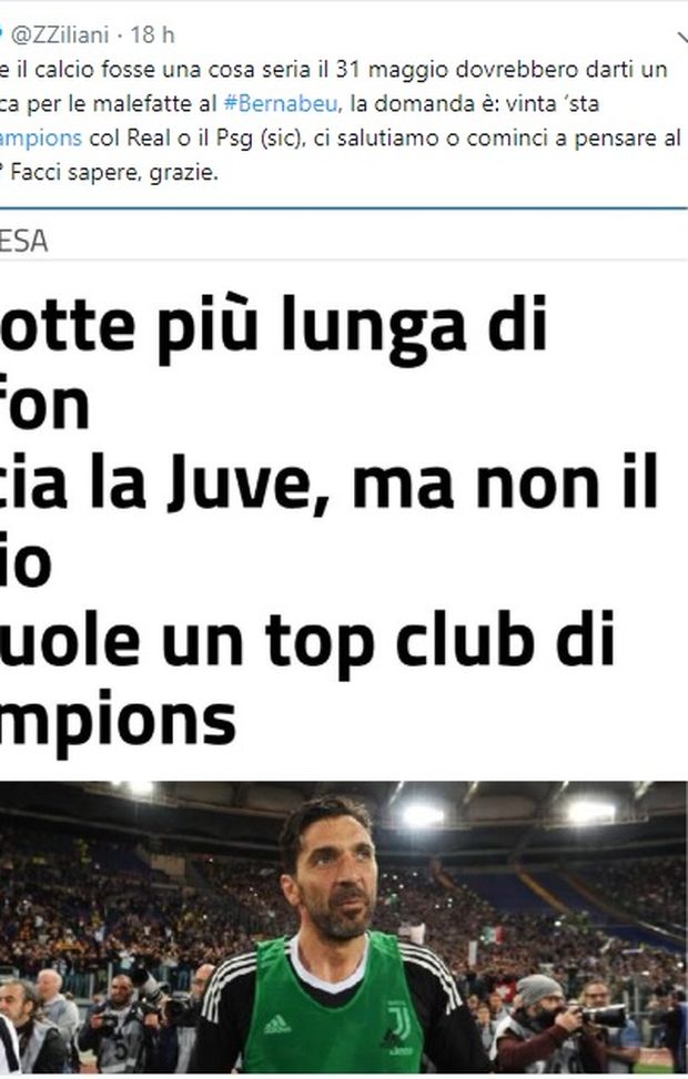 Gigi Buffon, a fine stagione, lascerà la Juventus. Il portiere bianconero non è riuscito nell'impresa di vincere la Champions League ma non è chiaro se lascerà anche il mondo del calcio. Paolo Ziliani, sui social, attacca pesantemente il numero uno della Juventus, rievocando l'uscita di Madrid sull'arbitro Oliver: "Premesso che se il calcio fosse una cosa seria il 31 maggio dovrebbero darti un anno di squalifica per le malefatte al Bernabeu, la domanda è: vinta ‘sta benedetta Champions col Real o il Psg (sic), ci salutiamo o cominci a pensare al Mondiale 2022? Facci sapere, grazie."