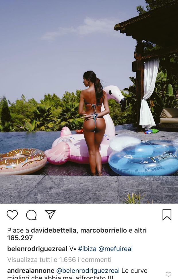 Belen Rodriguez, a Ibiza, mostra il lato B e il web impazzisce, ma anche il suo fidanzato Iannone: "Le migliori curve che abbia mai affrontato" e la showgirl replica: "Sei pazzo completamente".