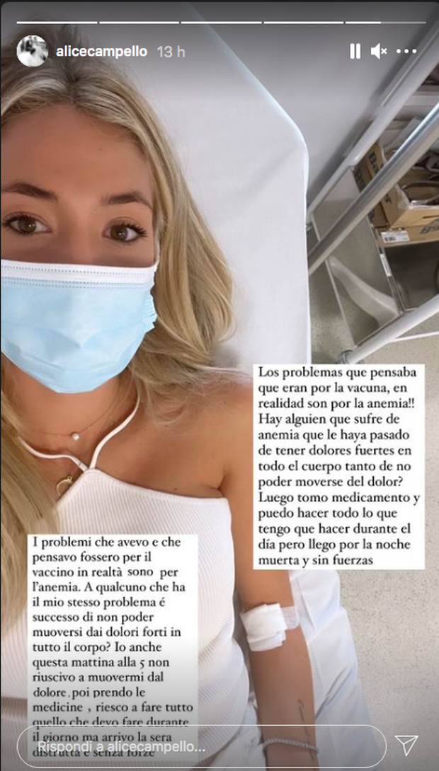 Non sono gli effetti collaterali del vaccino, ma anemia. Attraverso una Instagram Stories, Alice Campello chiarisce i motivi che nell'ultimo periodo l'hanno vista fiacca e senza forze. "I problemi che avevo e che pensavo fossero per il vaccino, in realtà sono per l'anemia. A qualcuno che ha il mio stesso problema, è successo di non potersi muovere dai dolori forti in tutto il corpo? Io anche stamattina all 5 non riuscivo a muovermi dal dolore, poi prendo le medicine e riesco a fare tutto quello quello che dovevo fare durante il giorno. Ma arrivo alla sera distrutta e senza forze"