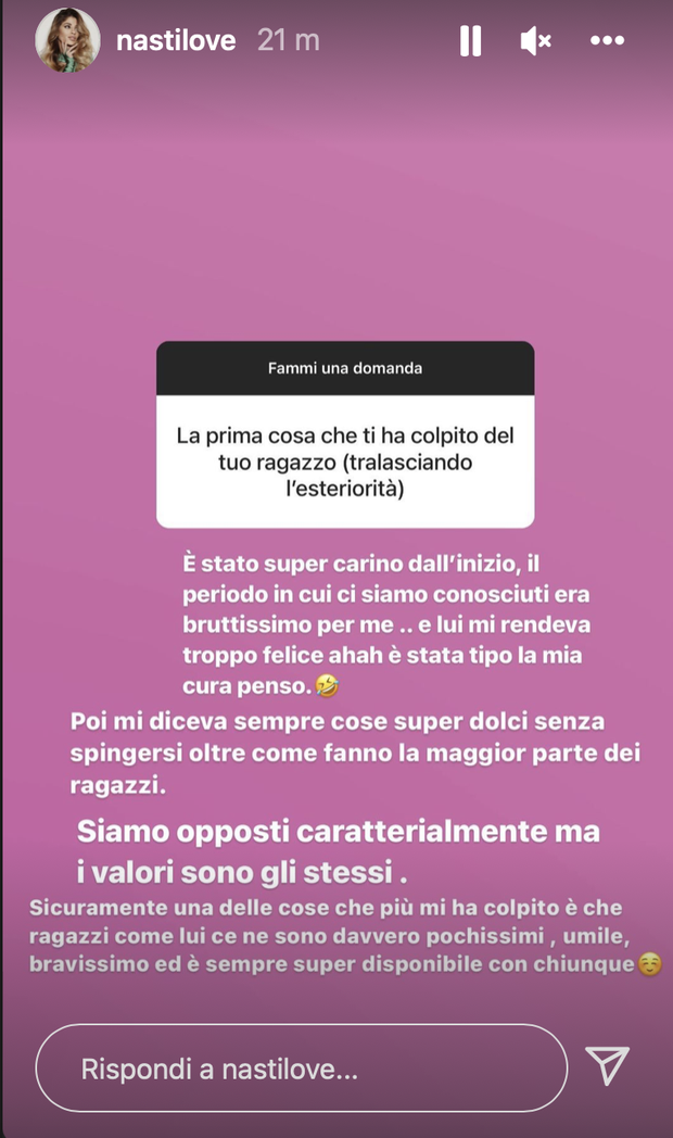 La prima cosa che l'ha colpita di Mattia Zaccagni. Questa la domanda posta da un fan a Chiara Nasti sui social. La risposta della modella non si è fatta attendere, con qualche dettaglio sul suo rapporto col calciatore: "E' stato super carino dall'inizio, il periodo in cui ci siamo conosciuti era bruttissimo per me... E lui mi rendeva troppo felice, è stato la mia cura penso. Poi mi diceva sempre cose super dolci senza spingersi oltre come fanno la maggior parte dei ragazzi. Siamo opposti caratterialmente, ma i valori sono gli stessi. Sicuramente una delle cose che più mi ha colpito è che ragazzi come lui ce ne sono davvero pochissimi: umile, bravissimo ed è sempre super disponibile con chiunque".