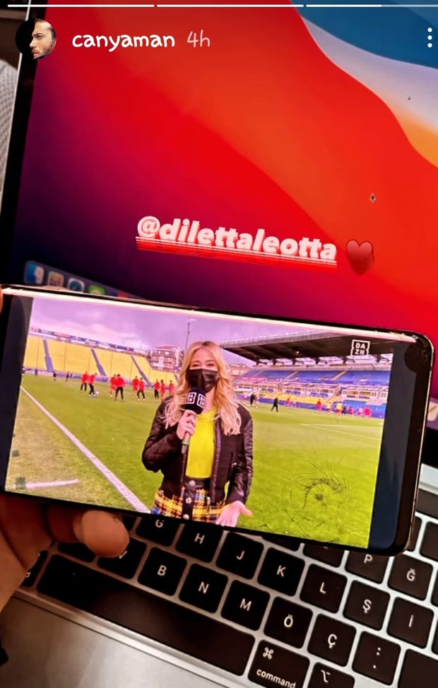 Lontano dagli occhi ma non lontano dal cuore. E con la tecnologia possono sentirsi più vicini. Can Yaman, fidanzato di Diletta Leotta, mentre lei è in tv per condurre il programma che racconta Parma-Roma, la osserva dal cellulare.