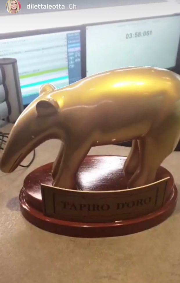 Diletta Leotta ha ricevuto il Tapiro d’oro per le dichiarazioni della giornalista Paola Ferrari, che aveva detto in un'intervista a Oggi: "Trovo diseducativo che una ragazza decida di rifarsi il seno e il lato B". Valerio Staffelli ha intercettato Diletta Leotta a Radio 105 e le ha chiesto cosa ne pensasse dell'accaduto. «Si, le ho sentite. Non seguo molto Paola Ferrari, sono contenta perché lei mi segue tanto invece e parla spesso di me. Mi fa piacere». L’inviato quindi chiede: «Ma è vero che si è rifatta?». Leotta smentisce: «Ma non è vero». La conduttrice ha poi commentato: "Sono davvero felice di aver vinto il mio primo Tapiro".