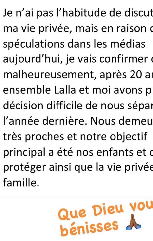 Il sito Afrik-foot ha ripreso le parole del giocatore ha spiegato che Drogba è stato costretto ad intervenire sulla questione perché è candidato alla presidenza della Federcalcio ivoriana. Nella storia, poi eliminata, aveva scritto. "Non ho l’abitudine di parlare della mia vita privata. Ma a causa delle speculazioni fatte dai media, posso confermare che, purtroppo, l’anno scorso, dopo 20 anni insieme, io e Lalla abbiamo preso la difficile decisione di separarci. Restiamo molto legati. Principalmente volevamo proteggere i nostri figli e la privacy della nostra famiglia. Dio vi benedica".