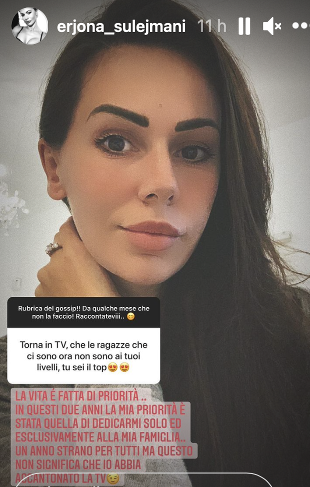Rispondendo ad alcune domande dei suoi follower di Instagram, Erjona Sulejmani, modella ed ex compagna del calciatore Blerim Dzemaili, ha risposto così ad un fan che la invitava a tornare in televisione: "La vita è fatta di priorità, in questi due anni la mia priorità è stata quella di dedicarmi solo ed esclusivamente alla mia famiglia. Un anno strano per tutti ma questo non significa che io abbia accantonato la TV".