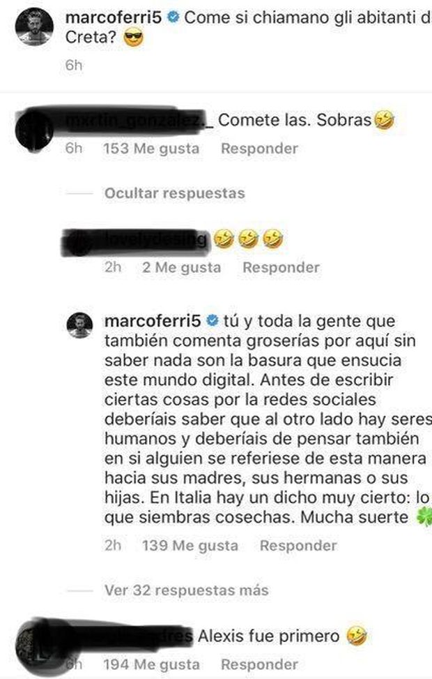 Un nuovo triangolo amoroso ha scosso il mondo del calcio. La modella di origini sudafricane Anna Modler non è più la fidanzata di Alexis Sanchez. Ora ha una una nuova relazione con Marco Ferri, influencer e figlio dell'ex giocatore dell'Inter. Le numerose foto romantiche postate a Creta confermano la nuova love story. E Alexis? A difenderlo sono scesi in campo i fan del giocatore cileno, che sotto ad una foto pubblicata da Ferri lo hanno attaccato e preso in giro per essersi messo insieme alla fidanzata di un altro. Tante battute alle quali Marco ha deciso di rispondere così: "Tu e tutte le persone che commentano anche la maleducazione qui intorno senza sapere nulla siete la spazzatura che sporca il mondo del web e dei social. Prima di scrivere certe cose dovresti sapere che dall'altra parte ci sono esseri umani. In Italia c'è un detto molto vero: quello che semini raccogli".
