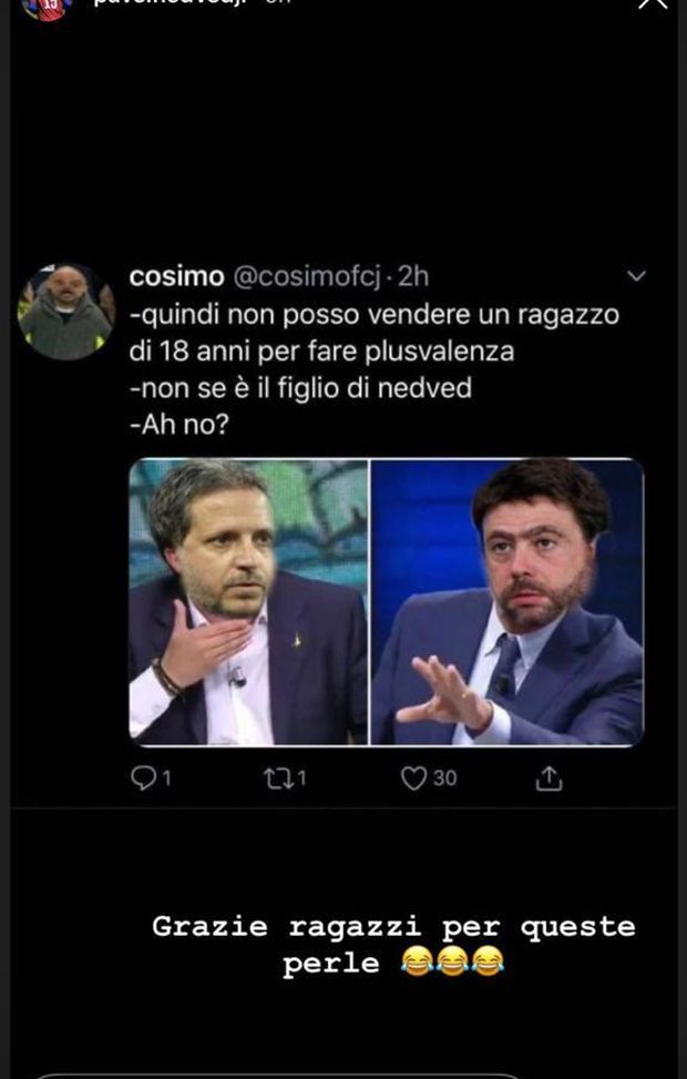 In questi giorni si è parlato molto delle plusvalenze portate a termine da Fabio Paratici per quanto riguarda il mercato e le casse della Juventus. Cifre alte, aggiustamenti e scambi in ottica prevalentemente finanziaria. A questo proposito il figlio di Pavel Nedved ha condiviso un meme molto divertente che lo riguardava direttamente, commentando così: "Grazie ragazzi per queste perle!"