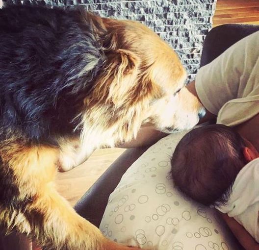 Il giocatore dell'Inter Andrea Ranocchia e Giulia, la sua compagna, hanno un cagnolino che si chiama Mela che nella foto si coccola il piccolo Lorenzo, il loro bambino nato a giugno.