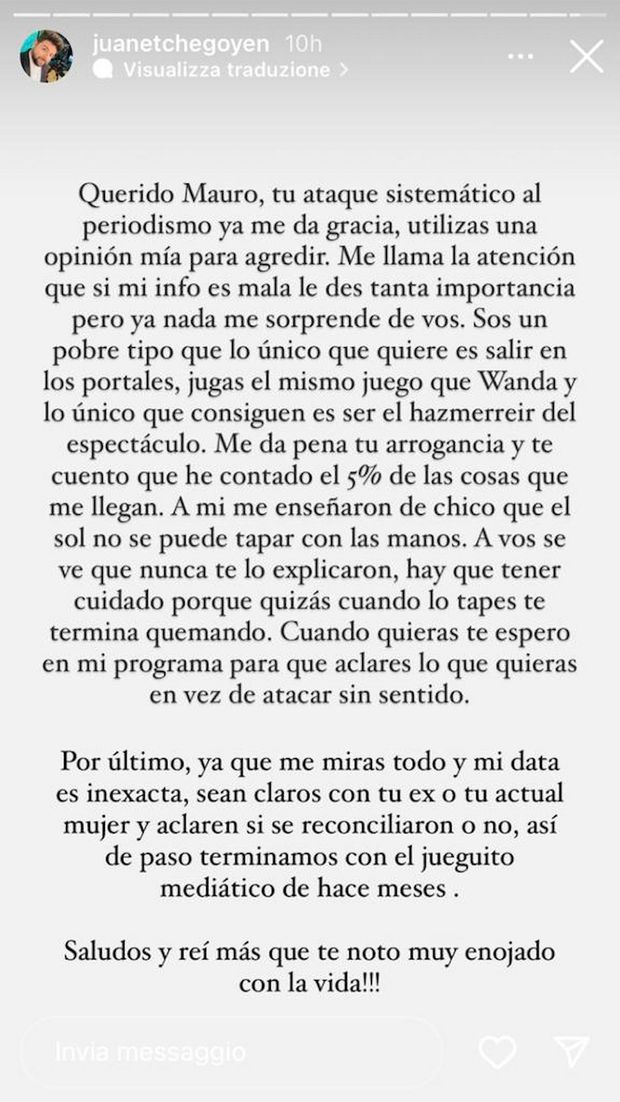 "Mi colpisce il fatto che tu dia così tanta importanza alle mie informazioni, se veramente sono errate. Ma niente mi sorprende più di te. Sei un povero ragazzo che vuole solo finire sui portali, giochi allo stesso gioco di Wanda e l'unica cosa che ottieni è essere lo zimbello del mondo dello spettacolo. Mi dispiace per la tua arroganza e ti dico che ho raccontato il 5% delle cose che mi sono arrivate. Mi è stato insegnato da bambino che il sole non può essere coperto con le mani. Mi sembra che non te l'abbiano mai spiegato, devi stare attento perché magari quando lo copri finisce che ti scotti. Quando vuoi, ti aspetto nel mio programma così puoi chiarire quello che vuoi invece di attaccare in maniera insensata. Infine, visto che guardi tutto e i miei dati sono imprecisi, sii chiaro con la tua ex o la tua attuale moglie e chiarisci se vi siete riconciliati o meno, è così che siamo finiti con il giochetto mediatico di mesi fa", ha risposto duramente JuanEtchegoyen.