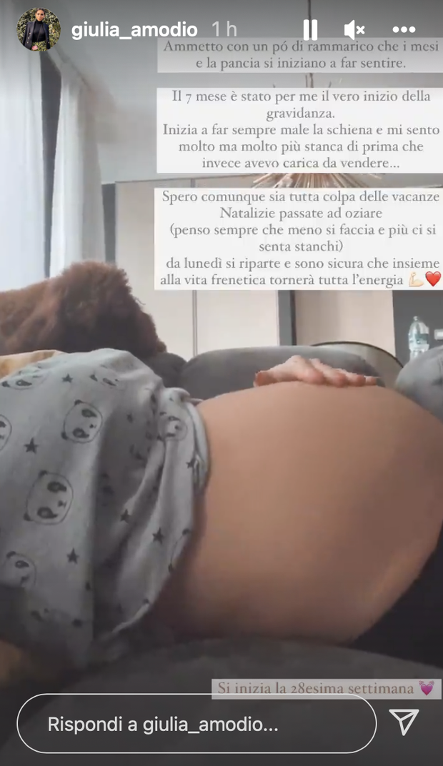 Si avvicina il grande momento per Giulia Amodio e Stefano Sensi: prosegue infatti la gravidanza dell'influencer, che presto darà alla luce la prima figlia della coppia. Intanto, la stessa modella ha voluto spiegare ai suoi follower di Instagram come si sente: "Ammetto con un po' di rammarico che i mesi e la pancia si iniziano a far sentire. Il 7o mese è stato per me il vero inizio della gravidanza. Inizia a far sempre male la schiena e mi sento molto ma molto più stanca di prima, che invece avevo carica da vendere. Spero comunque sia tutta colpa delle vacanze natalizie passate ad oziare (penso sempre che meno si faccia e più ci si senta stanchi). Da lunedì si riparte e sono sicura che insieme alla vita frenetica tornerà tutta l'energia".