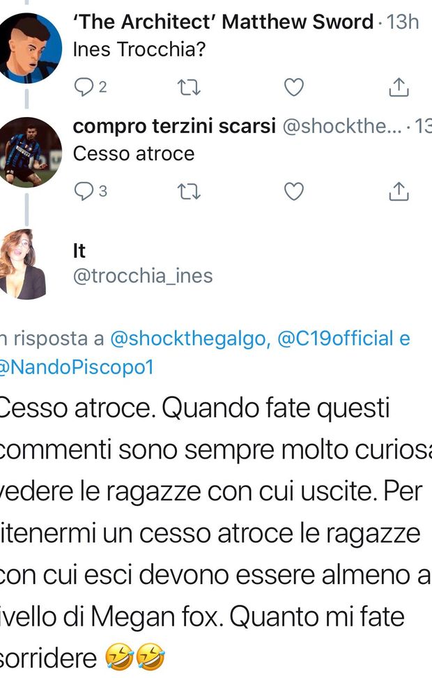 Ines Trocchia, modella e tifosa dell'Inter, ha un grosso seguito sui social. La show girl partecipa regolarmente a programmi che si occupano di calciomercato. Sui social però qualcuno l'ha offesa per quanto riguarda il suo aspetto fisico. Ines non si è tirata indietro e ha risposto con diplomazia: "Cesso atroce? Quando fate questi commenti sono sempre molto curiosa di vedere le ragazze con cui uscite. Per ritenermi un cesso atroce le ragazze con cui esci devono essere almeno al livello di Megan Fox. Quanto m fate sorridere".