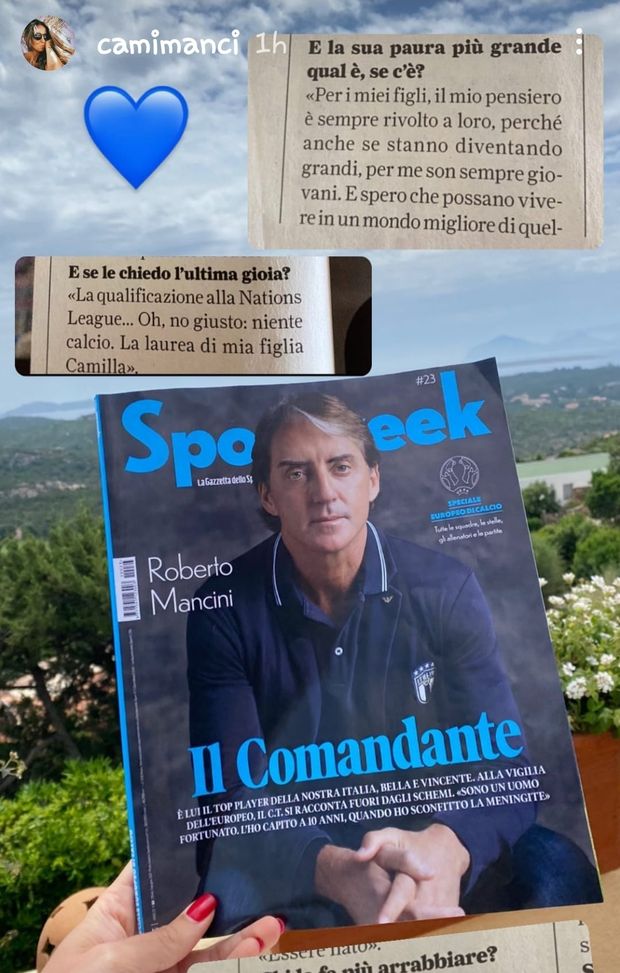 Camilla Mancini, figlia del ct della Nazionale italiana Roberto, ha postato sui social un'intervista rilasciata da suo padre a Sportweek. Ha condiviso alcuni passaggi dell'articolo, in particolare la parte nella quale il Mancio parla dei figli e dice: «Il mio pensiero è sempre rivolto a loro perché anche se stanno diventando grandi per me sono sempre piccoli».