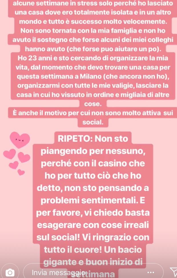 Il Grande Fratello ha decisamente cambiato la vita a Ivana Icardi, sorella del giocatore dell'Inter. Era successo anche in occasione della sua partecipazione all'edizione argentina, quando aveva conosciuto il fidanzato Luifa Galesio. Ora i due si sono presi una pausa e Ivana annuncia di essere alla ricerca di una casa a Milano: "Come sempre, devo chiarire perché il mio messaggio non è stato compreso. Non sto piangendo per nessuno. Ho trascorso alcune settimane in stress solo perché ho lasciato una casa in cui ero totalmente isolata e in un altro mondo e tutto è successo molto velocemente. Non sono tornata con la mia famiglia e non ho avuto il sostegno che forse alcuni dei miei colleghi hanno avuto (e che può aiutare un po'). Ho 23 anni e sto cercando di organizzare la mia vita, dal momento che devo trovare una casa per questa settimana a Milano (che ancora non ho), organizzarmi con tutte le mie valigie, lasciare la casa in cui ho vissuto in ordine e migliaia di altre cose. Questo è anche il motivo per cui non sono molto attiva sui social. Ripeto: non sto piangendo per nessuno, perché con il casino che ho per tutto ciò che ho detto, non sto pendano a problemi sentimentali. E per favore, vi chiedo basta esagerare con cose irreali sui social! vi ringrazio con tutto il cuore!"