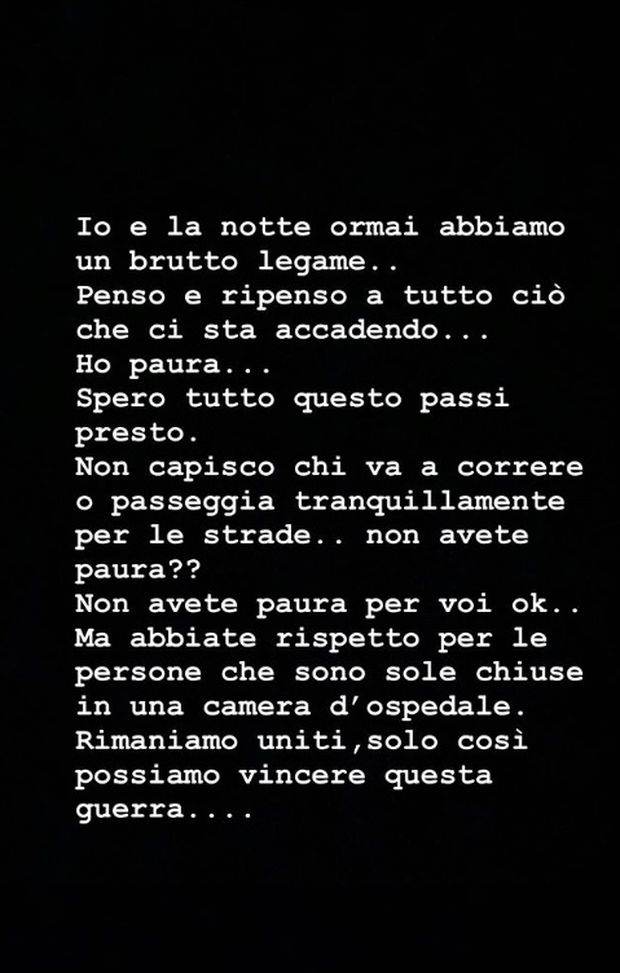 "Io e la notte abbiamo un brutto legame. Penso e ripenso a tutto ciò che ci sta accadendo. Ho paura... Spero tutto questo passi presto. Non capisco chi va a correre o passeggia tranquillamente per le strade. Non avete paura?? Non avete paura per voi, ok. Ma abbiate rispetto per le persone che sono sole chiuse in una camera d'ospedale. Rimaniamo uniti, solo così possiamo vincere questa guerra..."