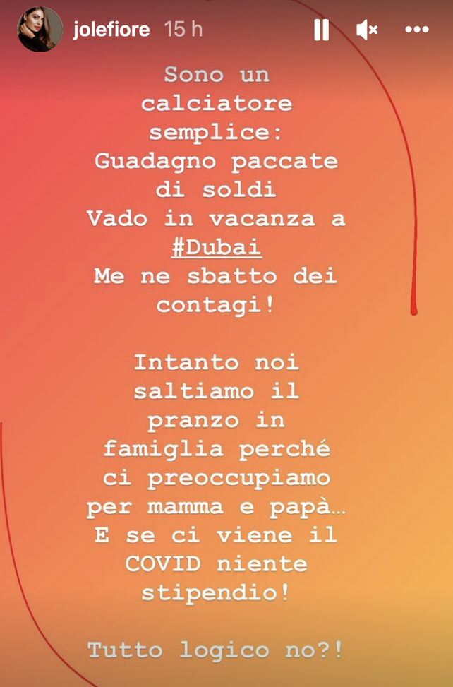 Jolanda De Rienzo non ci sta e sbotta. La conduttrice tv si è infatti scagliata contro i calciatori che per la pausa invernale del campionato hanno deciso di trascorrere le vacanze a Dubai nonostante l'emergenza sanitaria. Questo lo sfogo di Jolanda: "Sono un calciatore semplice: guadagno paccate di soldi e vado in vacanza a Dubai. Me ne sbatto dei contagi! Intanto noi saltiamo il pranzo in famiglia perché ci preoccupiamo per mamma e papà. E se ci viene il Covid, niente stipendio! Tutto logico, no?!".