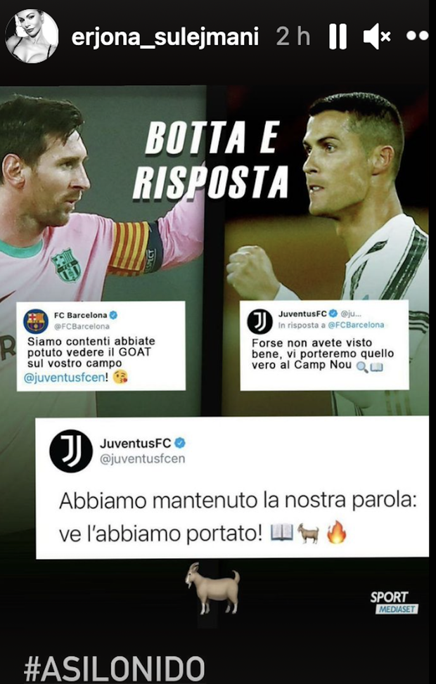 L'eterno duello tra Cristiano Ronaldo e Lionel Messi prosegue e ieri sera al Camp Nou ha recitato l'ennesimo capitolo: stavolta ne è uscito vincitore il portoghese, autore di una doppietta su rigore nella casa del rivale argentino. Tra Barcellona e Juventus è avvenuto poi un siparietto sui social su chi sia il G.O.A.T. (il migliore di sempre, ndr), ma Erjona Sulejmani, poco divertita da questo scambio tra i due club, ha commentato senza giri di parole il tutto in questa storia Instagram: "Asilo nido".