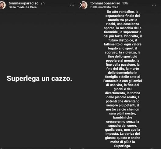 "Un atto vandalico, la separazione finale del mondo tra poveri e ricchi, una coscienza sporca, la macchia della tirannide, la supremazia del più forte, l'incivilità, il futuro distopico, il fallimento di ogni valore legato allo sport, il sorpruso, la violenza, la fine dello sport più popolare al mondo, la fine della passione, la fine del tifo, la morte delle domeniche in famiglia e delle aste al Fantacalcio con gli amici di una vita, la fine dei giochi e del divertimento, la tomba delle piccole realtà, i potenti che diventano sempre più potenti, il nostro calcio che non sarà più il nostro, bambini che cresceranno senza la squadra del cuore, quella vera non quella imposta. La deriva del giusto: questo e anche molto di più è la Superlega", ha dichiarato con toni drammatici Tommaso Paradiso su Instagram.