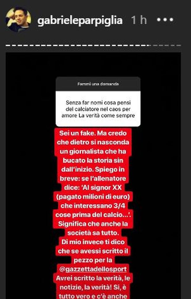A Gabriele Parpiglia, uno dei suoi follower, ha chiesto su Instagram cosa ne pensa della vicenda Nainggolan: il nome del giocatore non viene mai fatto ma si tratta senza nessun dubbio del calciatore belga dell'Inter al centro del gossip. Alcuni giornalisti esperti in materia, senza dimenticare quanto scritto da Corona sul suo magazine, hanno parlato di scappatella del giocatore nerazzurro con una ragazza conosciuta a Milano. Sarebbe stata proprio lei, dice l'ex re dei paparazzi, a confessare tutto sulla loro storia. Il giornalista di CHI, autore di varie trasmissioni tv, ha scritto in risposta sulle sue storie: «Sei un fake. Credo che dietro di te si nasconda un giornalista che ha bucato la storia dall'inizio. Spiego in breve. Se l'allenatore del giocatore dice che mette davanti al calcio 3-4 cose prima del calcio significa che anche la società sa tutto. Se io avessi scritto il pezzo per La Gazzetta dello Sport avrei scritto la verità, la notizia. Si è tutto vero e c'è anche di più. Milano non è Roma Milano è un paesello. E io non mento mai».