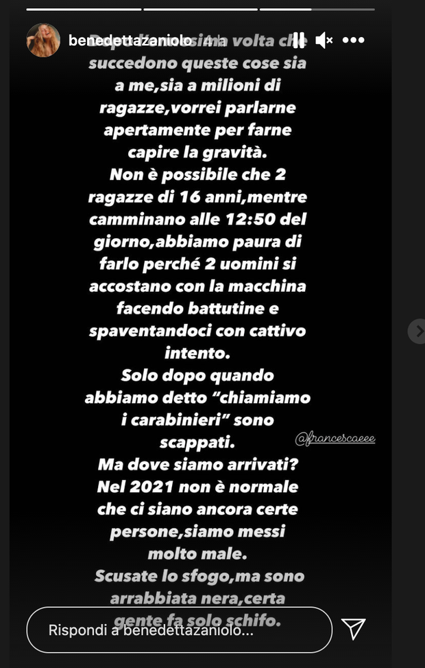 "Non è possibile che 2 ragazze di 16 anni, mentre camminano alle 12:50 del giorno, abbiano paura di farlo perché 2 uomini si accostano con la macchina facendo battutine e spaventandoci con cattivo intento. Solo dopo quando abbiamo detto "Chiamiamo i carabinieri" sono scappati.... Ma dove siamo arrivati? nel 2021 non è normale che ci siano ancora certe persone, siamo messi molto male. Scusate lo sfogo, ma sono arrabbiata nera, certa gente fa solo schifo", ha scritto la sorella del giocatore.