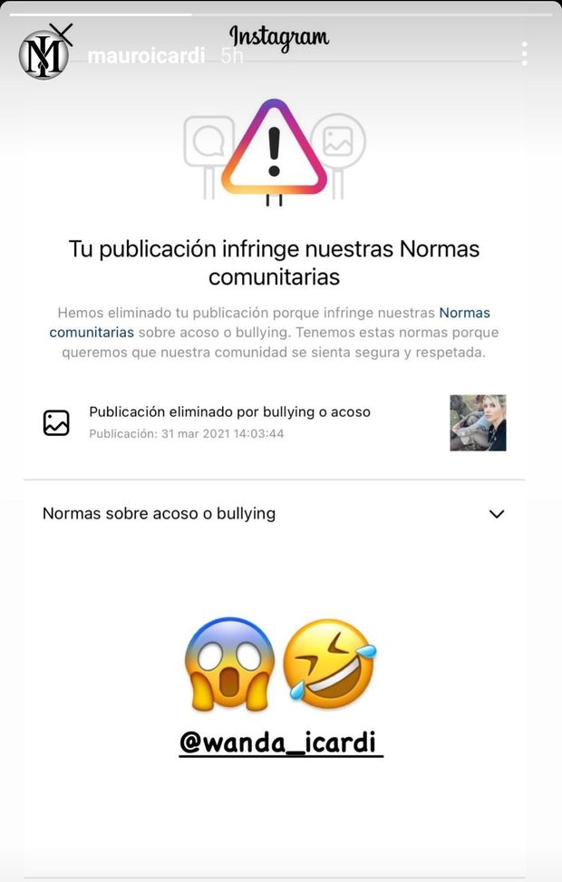 "Violazione delle regole della community". Instagram ha cancellato l'ultimo post pubblicato da Mauro Icardi sul suo profilo. Il social network ha deciso di eliminare la foto che ritraeva l'attaccante argentino in compagnia del suo animale domestico e di sua moglie Wanda Nara. "Il mio cane e la mia cagna" ha scritto Icardi.