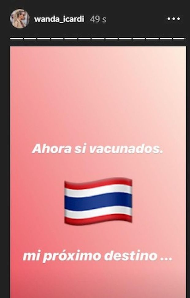 Un nuovo viaggio all'orizzonte per Wanda Nara e famiglia. La moglie e agente dell'attaccante dell'Inter, Mauro Icardi, ha infatti pubblicato una storia sul proprio Profilo Instagram in cui annuncia un viaggio in Thailandia nel prossimo futuro: "Ora sì, vaccinati. La mia prossima meta", ha scritto Wanda, con la bandiera del Paese asiatico.