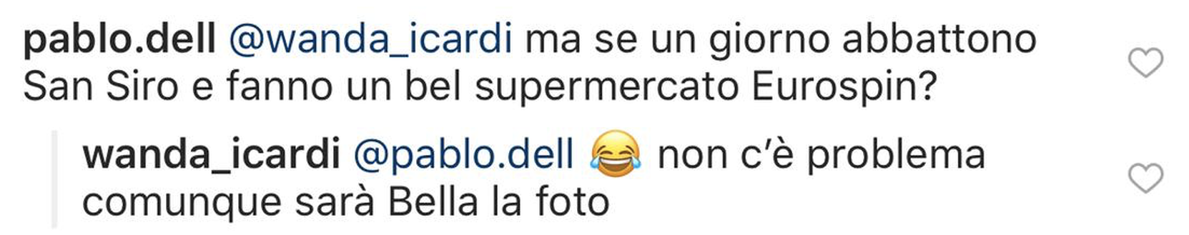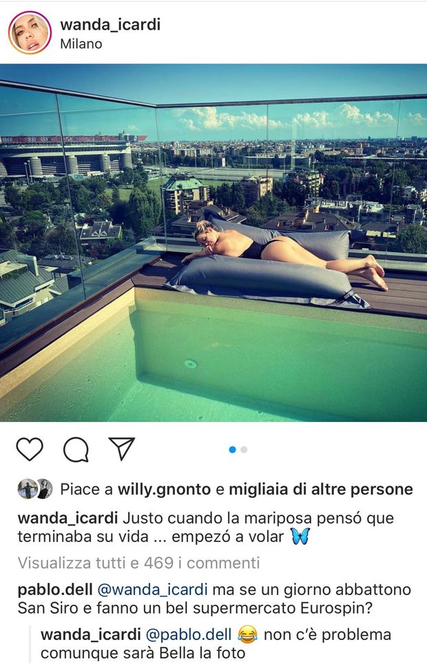 Wanda Nara si è concessa qualche ora di relax nel suo attico a Milano con vista San Siro. Il tutto documentato con uno scatto postato su Instagram che la ritrae a bordo piscina, in costume e con lo stadio sullo sfondo. Sotto la foto, poi, un curioso scambio di commenti con un fan in merito al Meazza: