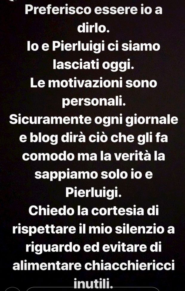 "Preferisco essere io a dirlo. Io e Pierluigi ci siamo lasciati oggi. Le motivazioni sono personali. Sicuramente ogni giornale e blog dirà ciò che gli fa comodo ma la verità la sappiamo solo io e Pierluigi. Chiedo la cortesia di rispettare il mio silenzio a riguardo ed evitare di alimentare chiacchiericci inutili".