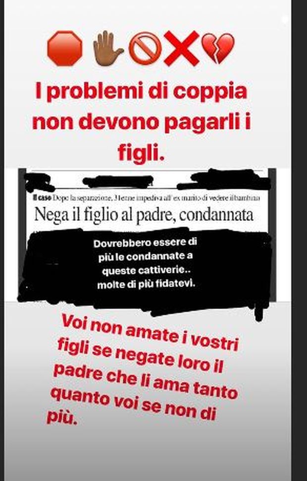 E forse per le controversie con la Fico (inizialmente lui non aveva riconosciuto la piccola ma poi lo ha fatto) ha scritto: «I problemi di coppia non devono pagarli i bambini. Dovrebbero di più le donne condannate per questa cattiveria, molte di più, credetemi. Voi non amate i vostri figli se gli negate di vedere il padre che li ama tanto quanto voi o se non di più. Non è rivolto a tutte le madri ovviamente. C'è chi ha sofferto di avuti e botte o altro e quindi è giusto in quel caso non farli avvicinare fino a quanto non vengono considerati 'sani'. Il mio messaggio è riferito a tutte quelle madri 'mostro' che per ragioni egoistiche, stupide e irragionevoli, agiscono in modo irresponsabile e cattivo non solo nei confronti dei padri, ma anche e soprattutto nei confronti dei figli che dicono di amare tanto".