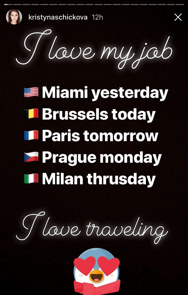 Kristyna Schickova, sorella del giocatore della Roma Patrik Schick, fa la modella e vive tra aeroporti e hotel. La modella ha condiviso su Instagram l'agenda dei voli che sta prendendo in questi giorni: da Miami a Milano, senza un attimo di tregua.