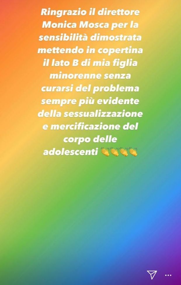La copertina di Gente ha sollevato grandi polemiche. Accanto a Francesco Totti c'è infatti la figlia tredicenne (Chanel): viso oscurato, ma lato B in primo piano. Francesco Totti ha deciso oggi di rispondere a questa scelta con un messaggio diretto alla responsabile della rivista: "Ringrazio il direttore Monica Mosca per la sensibilità dimostrata mettendo in copertina il lato B di mia figlia minorenne senza curarsi del problema sempre più evidente della strumentalizzazione e mercificazione del corpo delle adolescenti". Applauso ironico finale. Anche la moglie Ilary Blasi ha condiviso lo stesso messaggio sul suo profilo Instagram.