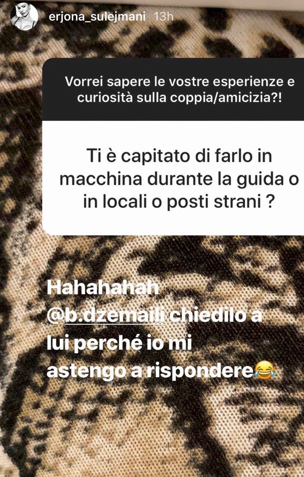 Erjona Sulejmani è molto seguita e apprezzata su Instagram. La modella risponde spesso alle curiosità dei suoi follower. Oggi ha rimbalzato una domanda decisamente hot. Un fan le ha chiesto se le fosse mai capitato di farlo in macchina mentre guidava o in altri posti strani. Erjona ha abilmente girato la domanda a Dzemaili: "Ahaha, chiedilo a lui perché io mi astengo dal rispondere".