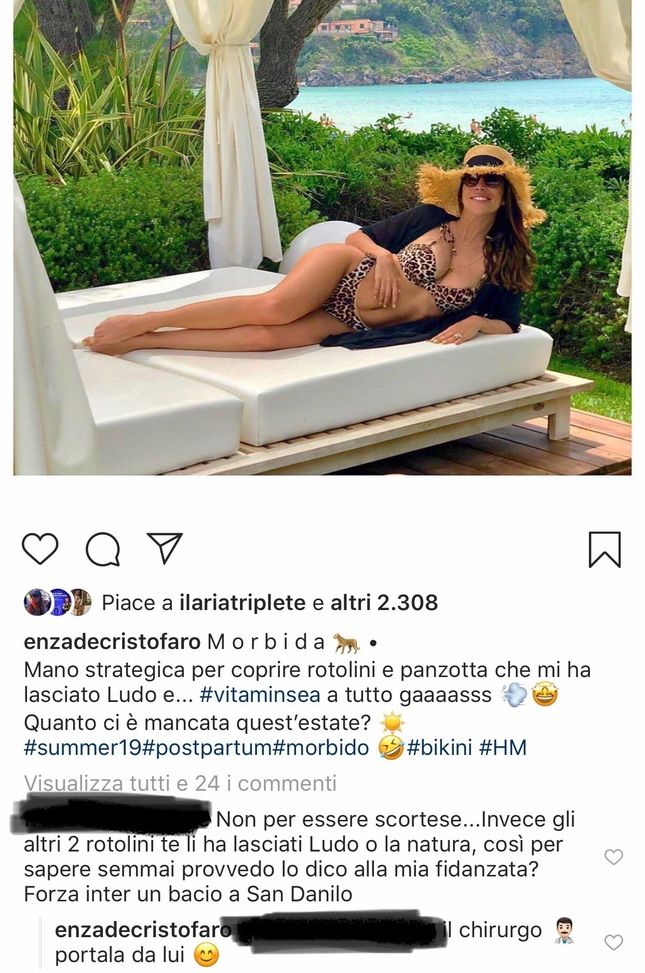 Enza De Cristofaro è bellissima anche dopo le due gravidanze. La moglie di D'Ambrosio ha fatto dell'autoironia su Instagram postando una foto e scherzando sulla mano strategia, messa lì per coprire i presunti "rotolini". Ma i fan l'hanno ricoperta di complimenti, uno in particolare le ha chiesto contro anche di altri "rotolini". E la risposta di Enza ha lasciato tutti di sasso...