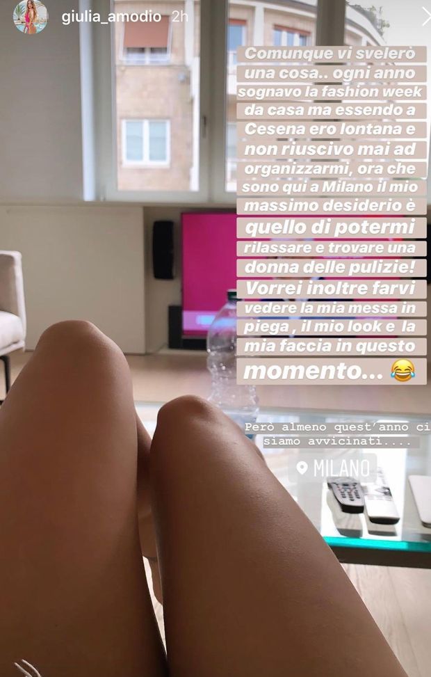 Giulia Amodio, fidanzata di Stefano Sensi, si gode la settimana della moda milanese con uno spirito insolito: "Comunque vi svelerò una cosa... ogni anno sognavo la fashion week da casa ma essendo a Cesena ero lontana e non riuscivo mai ad organizzarmi, ora che sono qui a Milano il mio massimo desiderio è quello di potermi rilassare e trovare una donna delle pulizie! Vorrei inoltre farvi vedere la mia messa in piega, il mio look e la mia faccia in questo momento... Però almeno quest'anno ci siamo avvicinati...". La coppia si è trasferita a Milano e sta ultimando il trasloco.