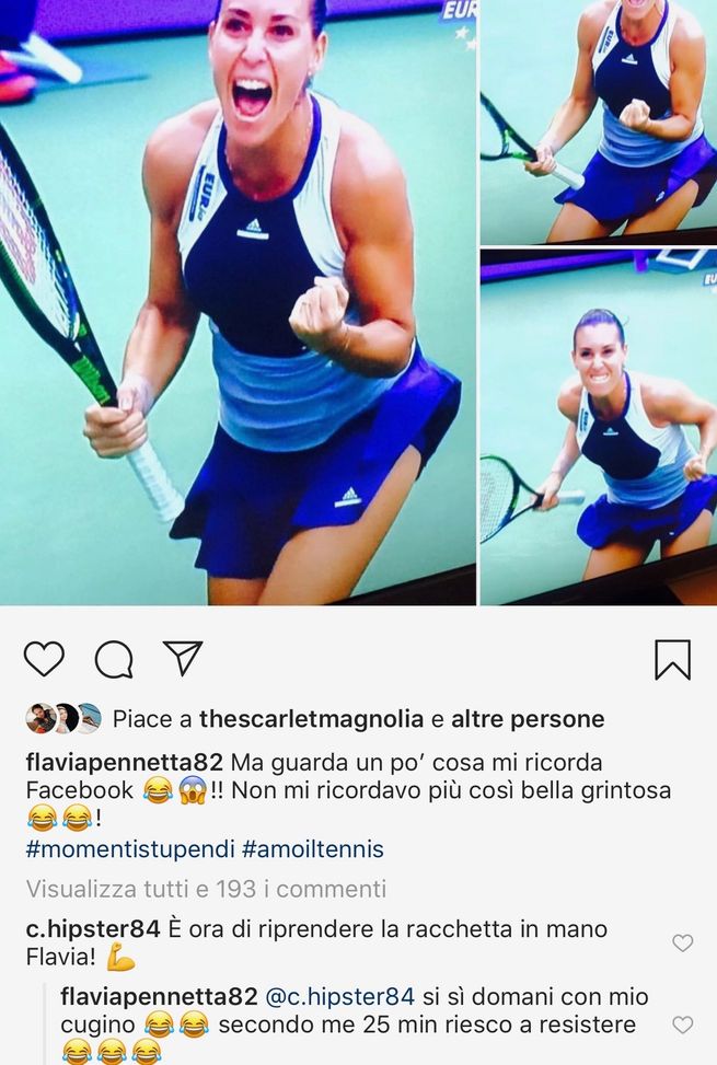Flavia Pennetta è in dolce attesa del secondo figlio e si gode la famiglia. Spazio anche per qualche momento nostalgico, vista la fantastica carriera come tennista e gli incredibili traguardi raggiunti. "Non mi ricordavo così bella grintosa", ha scritto Flavia su Instagram condividendo alcuni scatti. Un follower ha colto la palla al balzo per chiederle di ritornare: "È ora di riprendere la racchetta in mano!" La risposta? "Sì, sì.. domani con mio cugino. Secondo me 25 minuti riesco a resistere", ha commentato ironicamente Flavia.