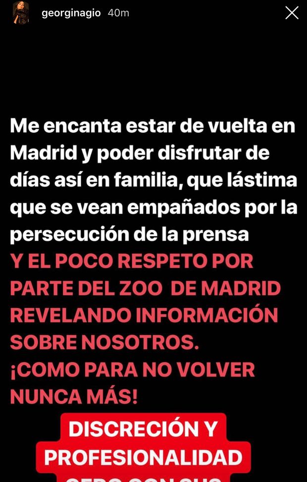 Georgina Rodriguez ha visitato insieme ai figli lo zoo di Madrid. Poteva essere una giornata serena all'aria aperta insieme alla sua famiglia, ma la poca discrezione dei responsabili dello zoo hanno irritato la fidanzata di Cristiano Ronaldo: "Adoro tornare a Madrid e godere di giornate in famiglia del genere, che vergogna che sia stata offuscata dalla persecuzione della stampa e dal piccolo rispetto da parte dello Zoo di Madrid che ha svelato informazioni su di noi: come non tornare mai più! ". La modella ha aggiunto: "Zero discrezione e professionalità con i loro clienti".