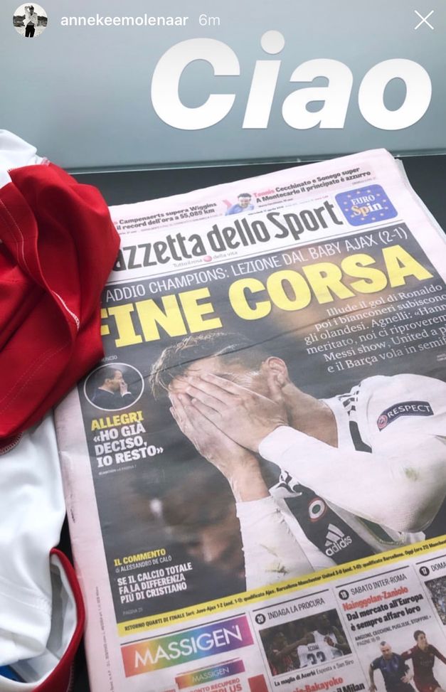 Matthijs de Ligt è entrato nelle giovanili dell’Ajax nel 2009, quando appena 10 anni. È in prima squadra dal 2016, da quando di anni ne aveva 17. Il 24 maggio 2017 era in campo nella finale di Europa League persa dall’Ajax. Da questa stagione è il capitano dell’Ajax, ad appena 19 anni. Un percorso incredibile, che ieri ha dato i suoi frutti: l'Ajax di de Ligt ha infatti eliminato la Juventus. Il giorno dopo l'euforia è ancora a mille. AnneKee Molenar, fidanzata di de Ligt, ha pubblicato numerosi scatti allo stadio e durante la festa dopo la partita. E anche un saluto speciale a Cristiano Ronaldo, con la prima pagina della Gazzetta dello Sport e un ironico "ciao".