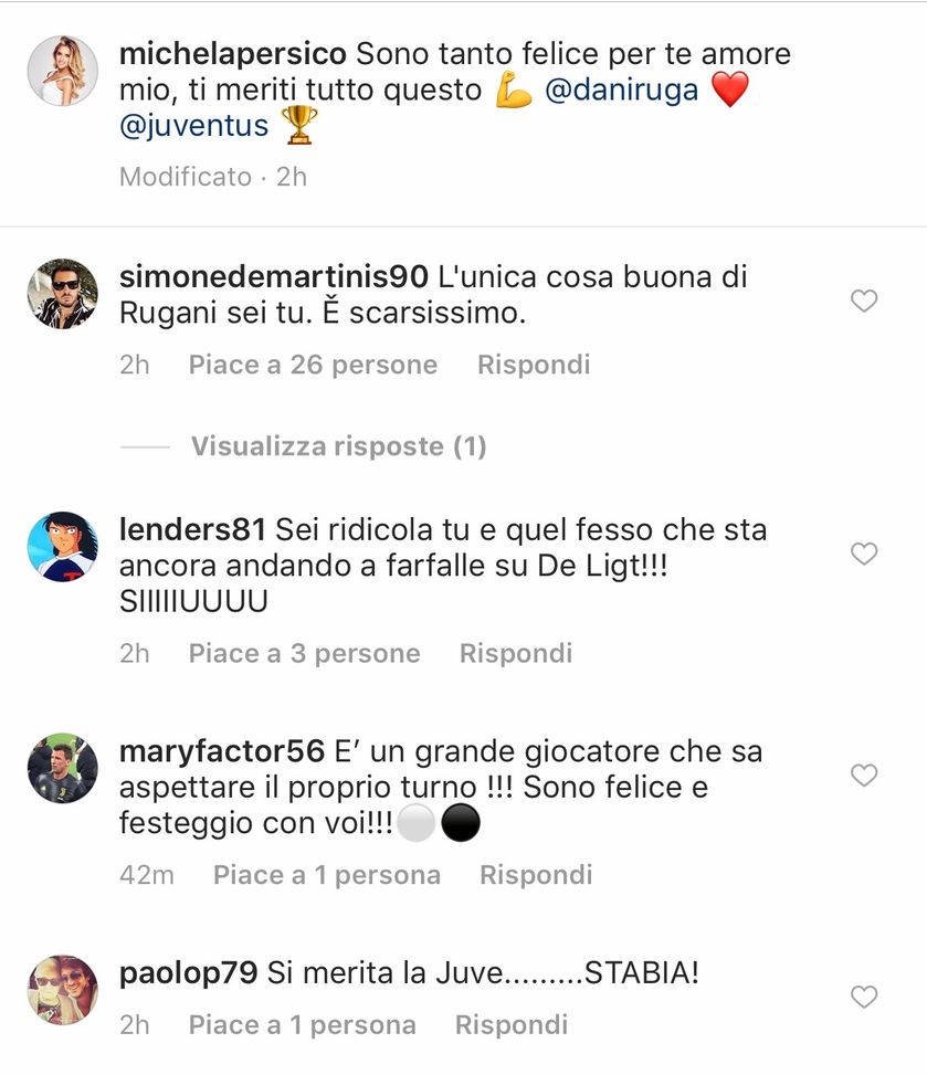 La Juventus ha festeggiato oggi l'ottavo scudetto. Michela Persico, fidanzata di Daniele Rugani, ha voluto condividere una dedica speciale al giocatore bianconero: "Sono tanto felice per te amore mio, ti meriti tutto questo". Ma la maggior parte dei fan non era d'accordo con la giornalista sportiva e le ha ricordato le colpe del fidanzato nella partita contro l'Ajax, costata ai bianconeri l'eliminazione dalla Champions League. "Ti meriti la Juve Stabia", "l'unica cosa buona di Rugani sei tu", hanno commentato numerosi suoi ammiratori.