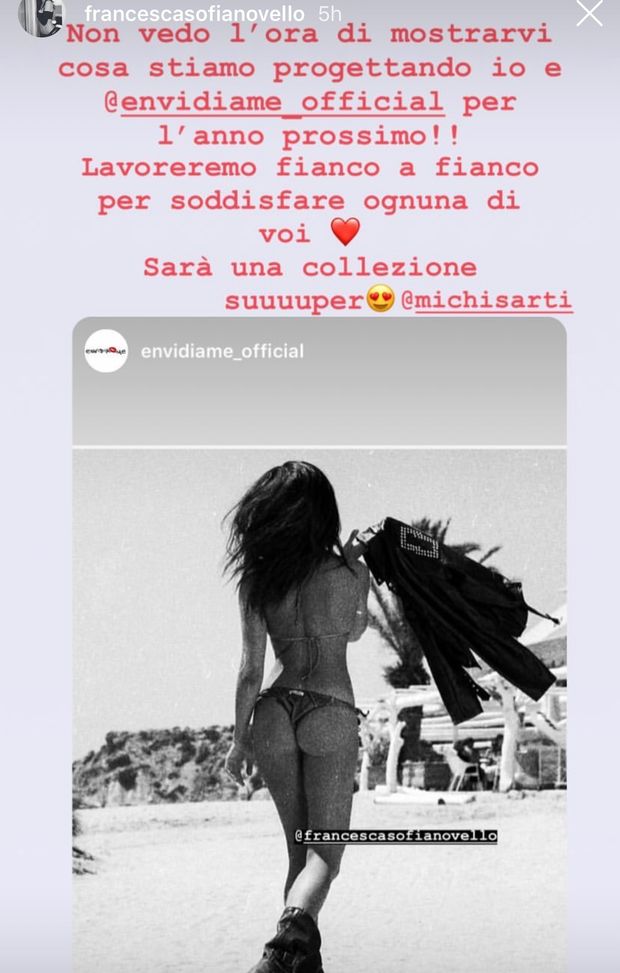 Non solo modella. Francesca Sofia Novello ha deciso di impegnarsi in un progetto da "stilista" e lavorare ad una collezione di costumi insieme al brand Envidiame. Lo ha annunciato la stessa fidanzata di Valentino Rossi: "Non vedo l'ora di mostrarvi cosa stiamo progettando io e Evidiame per l'anno prossimo! Lavoreremo fianco a fianco per soddisfare ognuna di voi. Sarà una collezione super!". La modella ha poi lanciato diversi sondaggi per testare il gradimento del suo pubblico di alcuni modelli di costume.