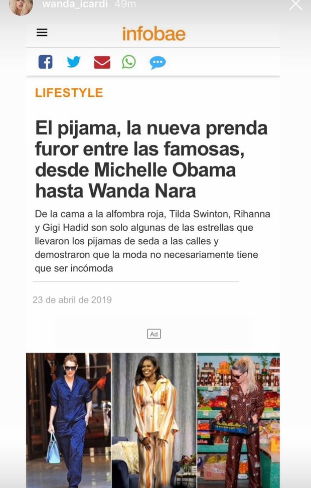 Ora però i giornali di moda regalano una piccola rivincita a Wanda Nara: quella di indossare il pigiama in occasioni non casalinghe rappresenta infatti la nuova tendenza tra le dive e le celebrità. Diversi siti argentini hanno dedicato alla questione alcuni articoli, prontamente condivisi da Wanda sui suoi social: da Michelle Obama a Wanda Nara, ecco la tendenza che fa furore.